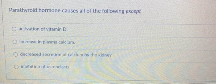 O inhibition of osteoclasts. A enhance the reabsorption of calcium at the kidneys. Parathyroid hormone causes all of the following except activation of vitamin D.